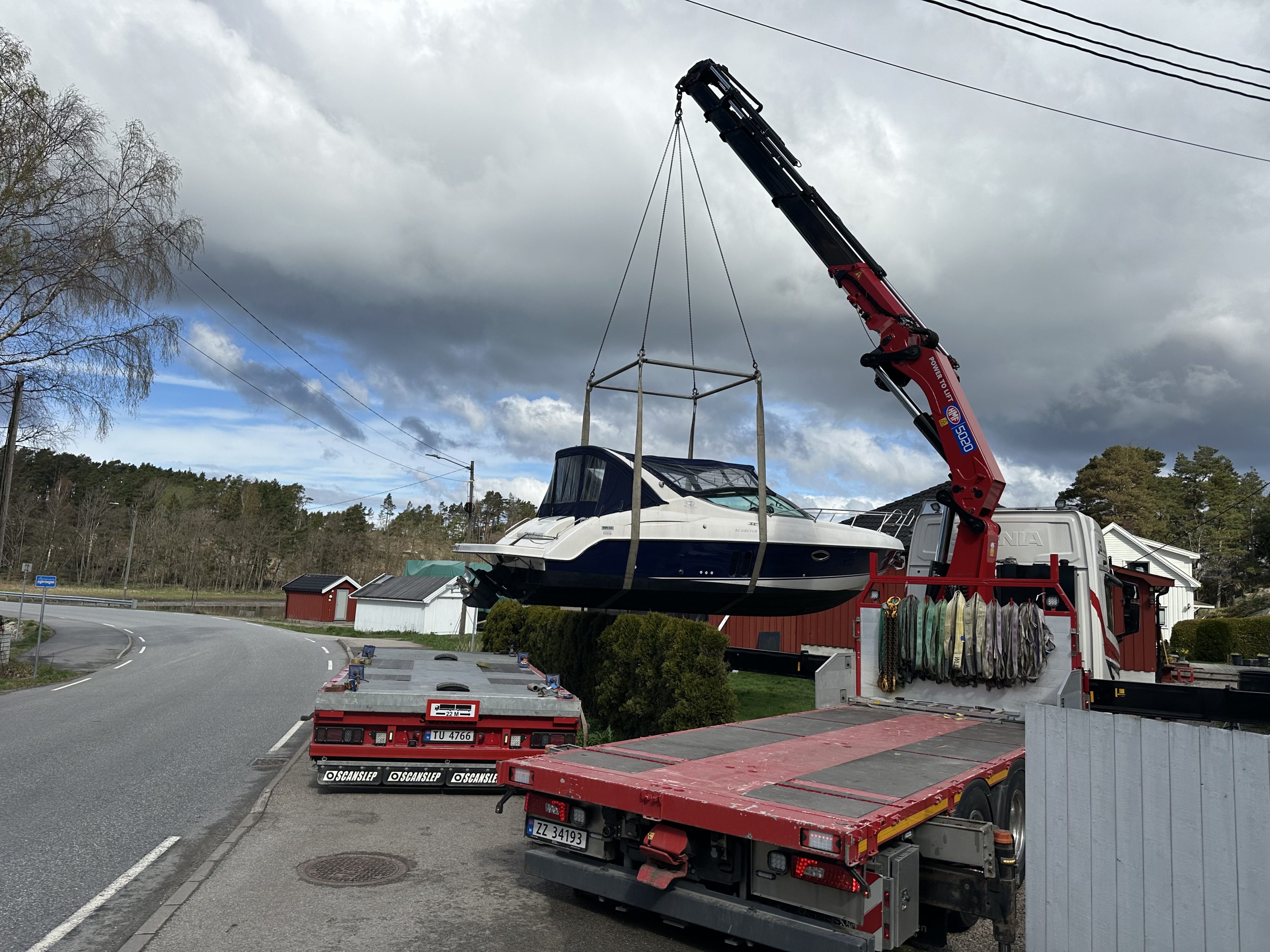 Transport av båt med kranbil, inkludert løft og plassering. - Løft og flytting